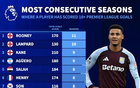 德转统计英超历史连续最多赛季进球数上双球员: